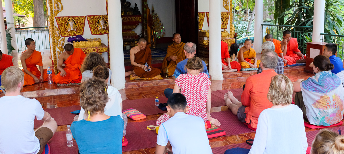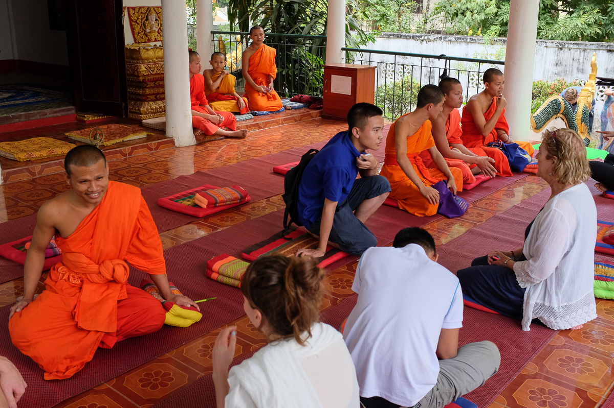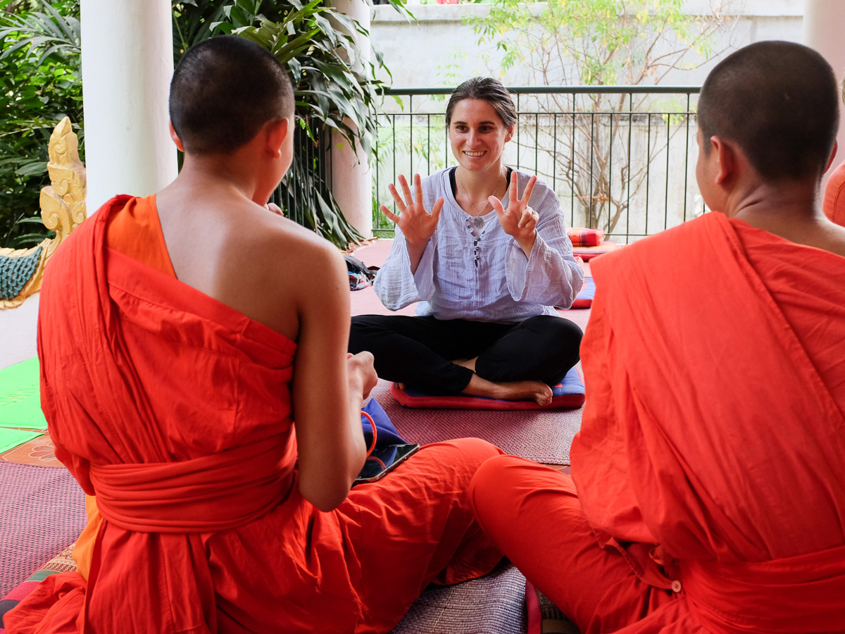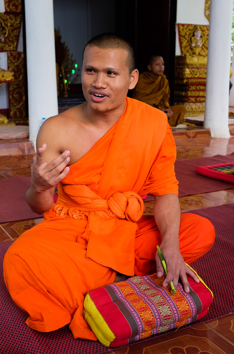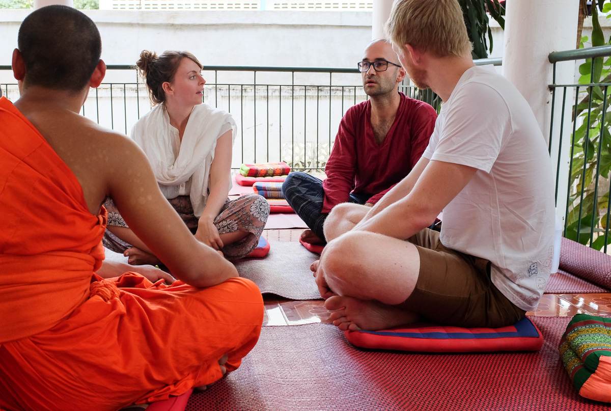 Prima oră este pentru discuții între călugări și vizitatori. Ideea este de a genera conversație pentru ca ei să-și exerseze limba engleză. Sunt mulți călugări care vin din alte templule cu acest scop. Se formează grupuri și de acolo discuția decurge de la sine.