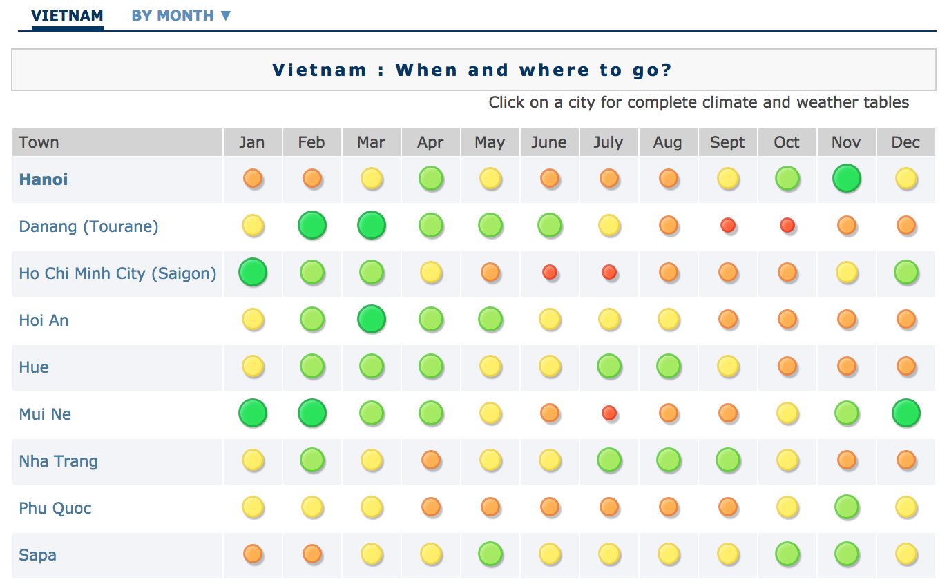 De la nord la sud, Vietnam experimentează două sau chiar trei anotimpuri simultan, după cum se poate vedea în imaginea de mai jos: