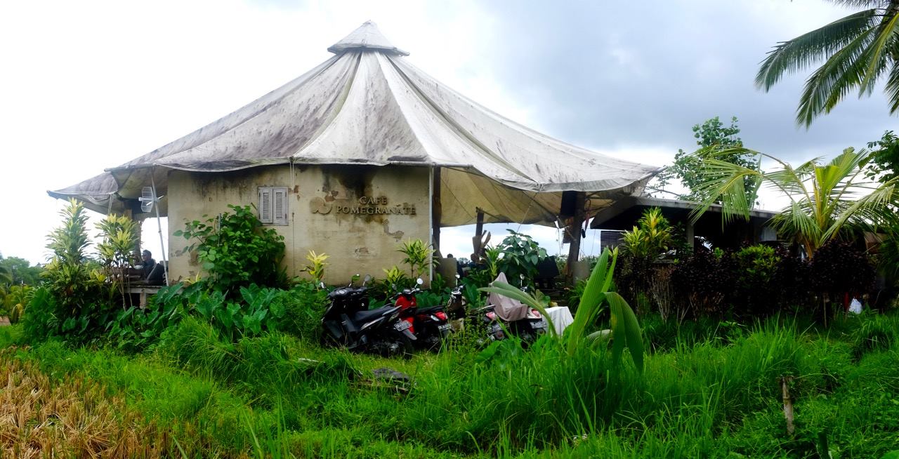 De fiecare dată când mă gândeam la Bali, mă gândeam la această orezărie și la acel loc unde am mâncat. Mi-am dorit să îl regăsesc la fel și să nu îl fi suflat vreun vânt sau să nu îl fi închis autoritățile pentru condițiile din bucătărie. Ne-am cazat în centrul Ubudului și am început să căutăm orezăria magică, nici nu știam dacă are un nume. Am găsit restaurantul pe TripAdvisor, pe numele lui, Pomegranate. Nu ne-a venit să credem, era chiar recomandat pentru unul din locurile unde expații vin să lucreze. Am mers acolo și încă mai este, dar nu numai că mai este, l-au și renovat acum câteva luni. Au păstrat structura, dar au pus un acoperiș mai zdravăn și o podea faină, au schimbat mesele și bucătăria arată a bucătărie.