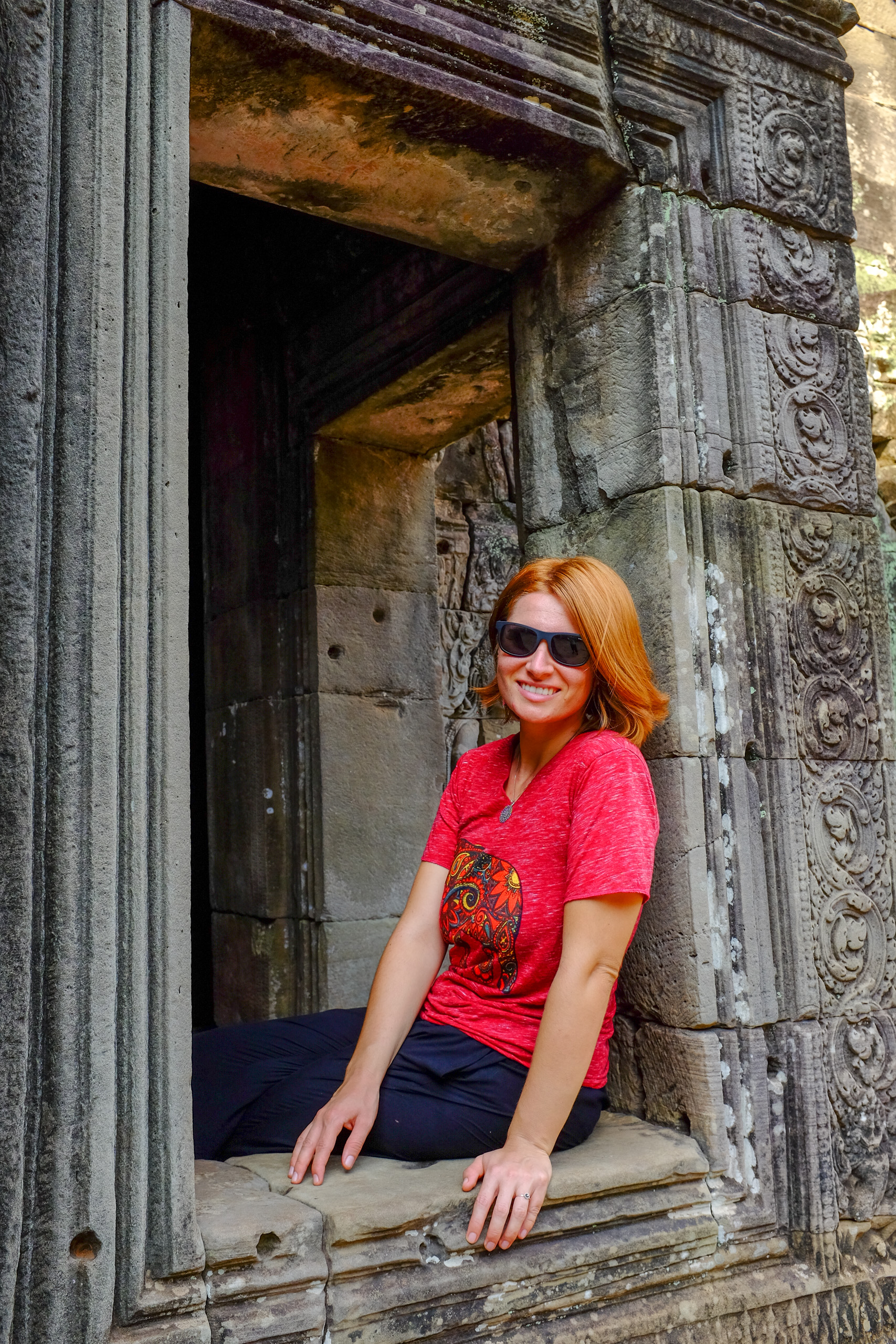 - Când mergi la Angkor Wat ți se va spune la hotel să iei pantaloni lungi, încălțăminte închisă și bluze cu mânecile lungi. Eu înțeleg că e un loc sacru, dar am văzut fete cu bustiere și pantaloni scurți. Asta e extrema, nu mergeți așa, dar nici nu vă înfofoliți cum am făcut noi. E ok un tricou, sunt ok sandale, e ok o pereche de pantaloni până la genunchi. Te sfătuiesc să ai o eșarfă, în caz că e nevoie să îți acoperi o parte a corpului. Noi am cumpărat tricouri de pe drum cu 3$ ca să ne schimbăm pentru că erau peste 34 de grade și transpiram în continuu. Deci dacă mergi la pedalat și e cald afară, ia-ți și schimb la tine.