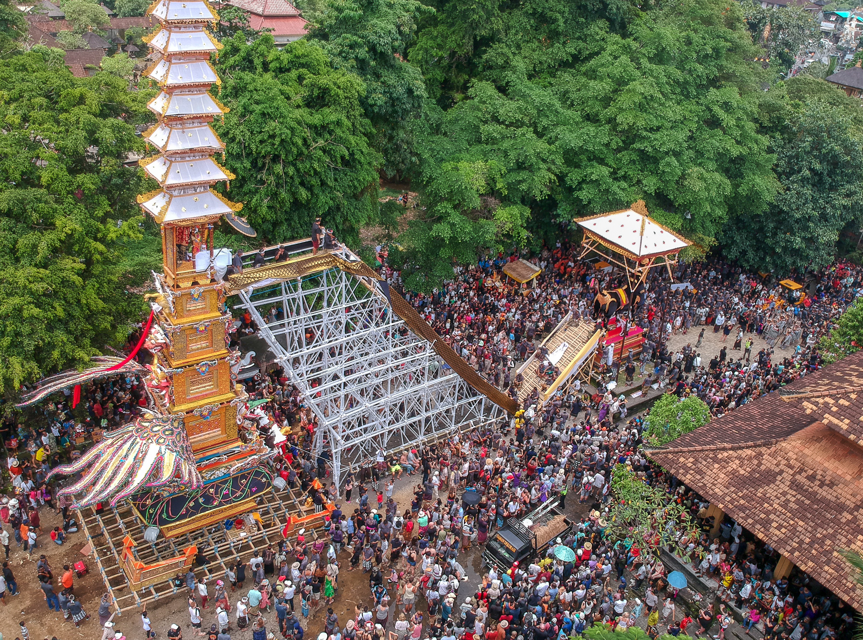 Erau încă trei drone în aer, deci cu excepții regale se puteau ridica dronele și deasupra mulțimii. Unde sunt trei are loc și a patra. Am lansat-o cu greu, a trebuit să intrăm pe o străduță alăturată, pentru că altfel mulțimea era în mișcare continuă și tot ce puteam face era să înaintăm cu ei. Am ajuns pe o caniculă mare la cimitir. Ceea ce ni s-a părut interesant a fost că după ce au ajuns acolo, mulțimea a făcut cale întoarsă. Parcă de fapt nimeni nu mai era interesat de incinerarea în sine și de corpul acelei femei. Au rămas mai mulți turiști curioși decât localnici. Poate unul din motive a fost că urma să îi dea foc în 3 ore. Am plecat și noi, dar ne-am întors după 3 ore, când era de-a dreptul pustiu pe acolo. Monumentul în formă de vacă era ars aproape complet împreună cu trupul soției regelui. După alte ceremonii care vor dura alte câteva zile timp în care se va arde și celălalt monument, ceremonia de incinerare se consideră încheiată și cenușa rezultată de la toate va fi aruncată în mare.