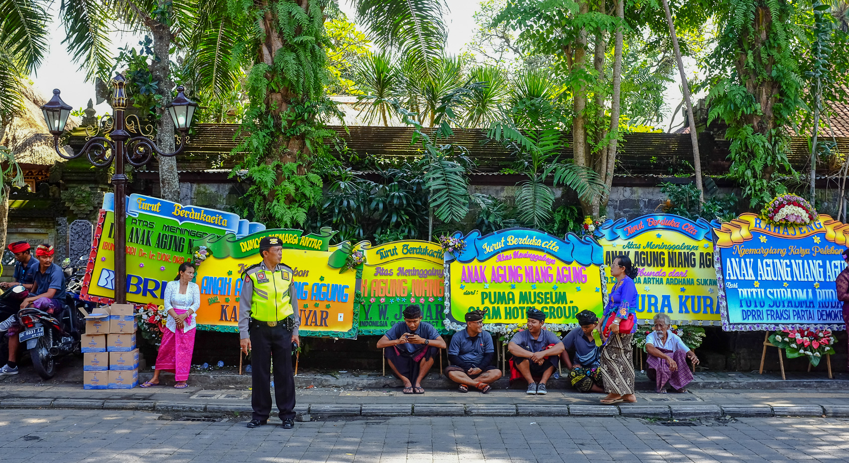 În ziua cu pricina ne-am înarmat cu aparatul foto și cu drona, deși ne gândeam că nu avem cum să o ridicăm pentru că în Indonezia nu ai voie cu drona deasupra mulțimii. Eu mi-am încins la brâu un sarong, Cristi l-a pus în rucsac pe al lui și am plecat spre palatul regal, situat la câteva sute de metri de cazarea noastră. Am ajuns acolo deja obosiți de la caniculă. Era o forfotă continuă, în stânga și în dreapta, cu poliție, mașini, scutere, muzică.