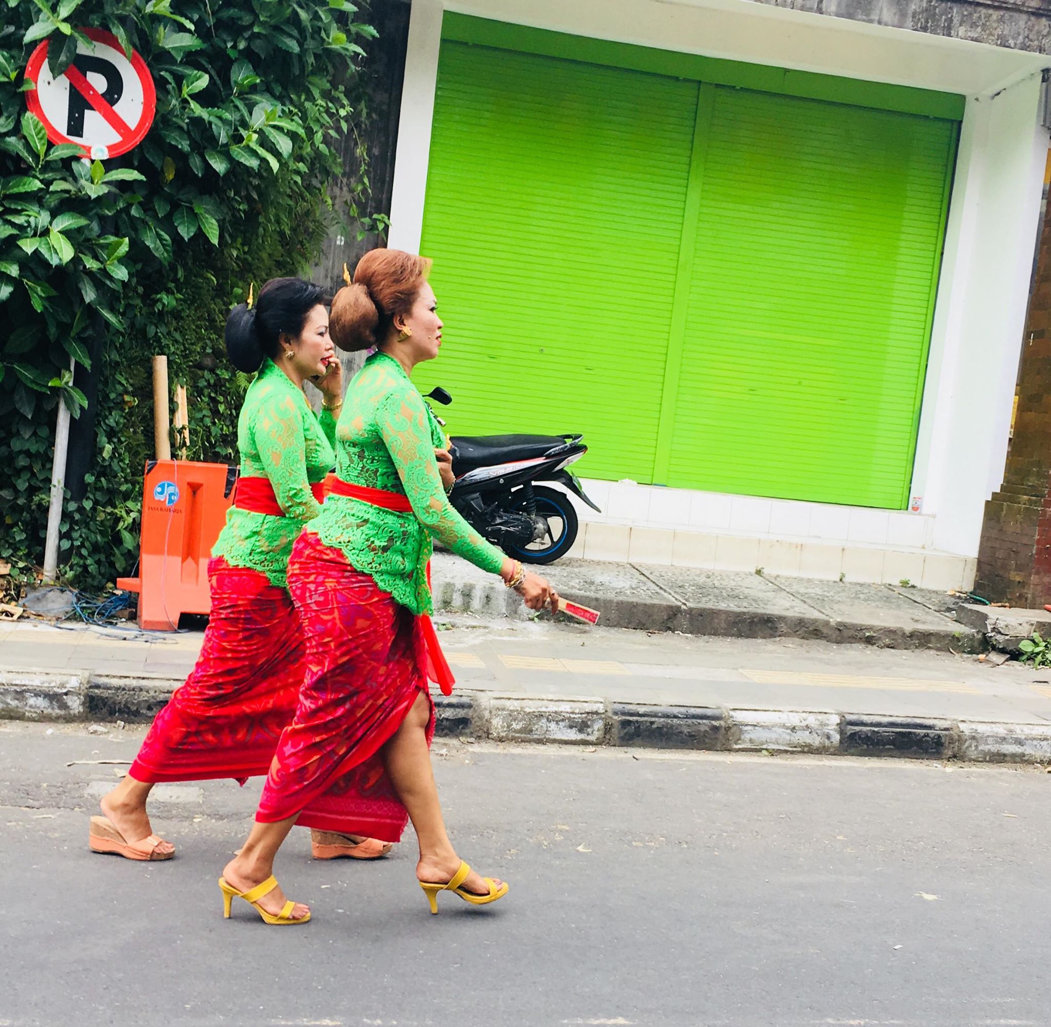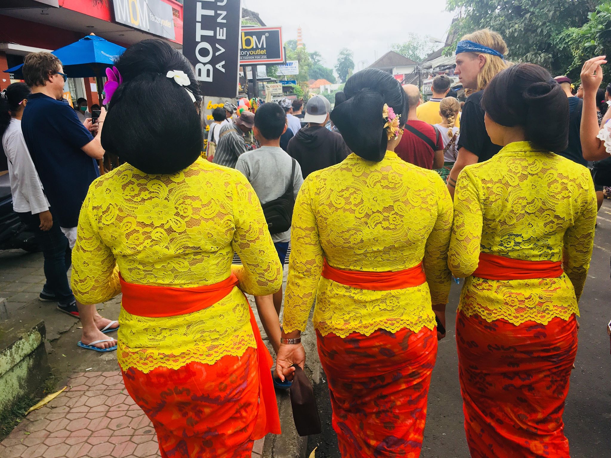 – atunci când moare cineva din familia regală, din fiecare comunitate există cel puțin 3 femei care se îmbracă în culorile tradiționale ale acelei comunități. La ei o comunitate înseamnă câteva străzi dintr-un oraș. De exemplu, noi stăm acum în comunitatea Taman din centrul Ubudului care se întinde cam pe 2 kilometri. Pentru doamnele din imaginile de mai jos, ceremonia a început de dimineață când au mers la coafor și la machiaj. Ele sunt reprezentantele a două comunități. Știm că cele în galben reprezintă comunitatea Taman, pentru că am recunoscut una dintre ele care locuiește pe strada paralelă față de cea unde stăm noi. 🙂