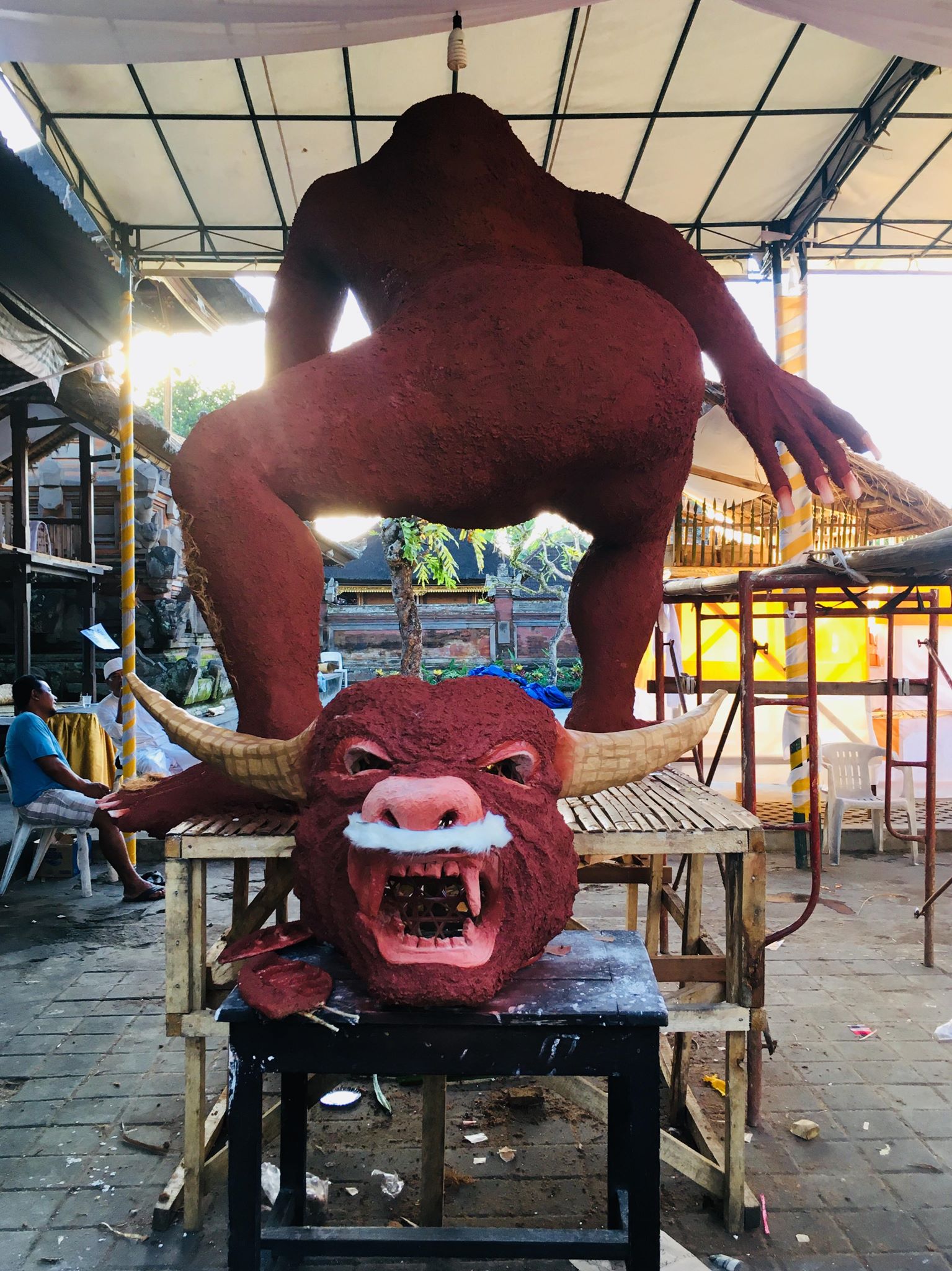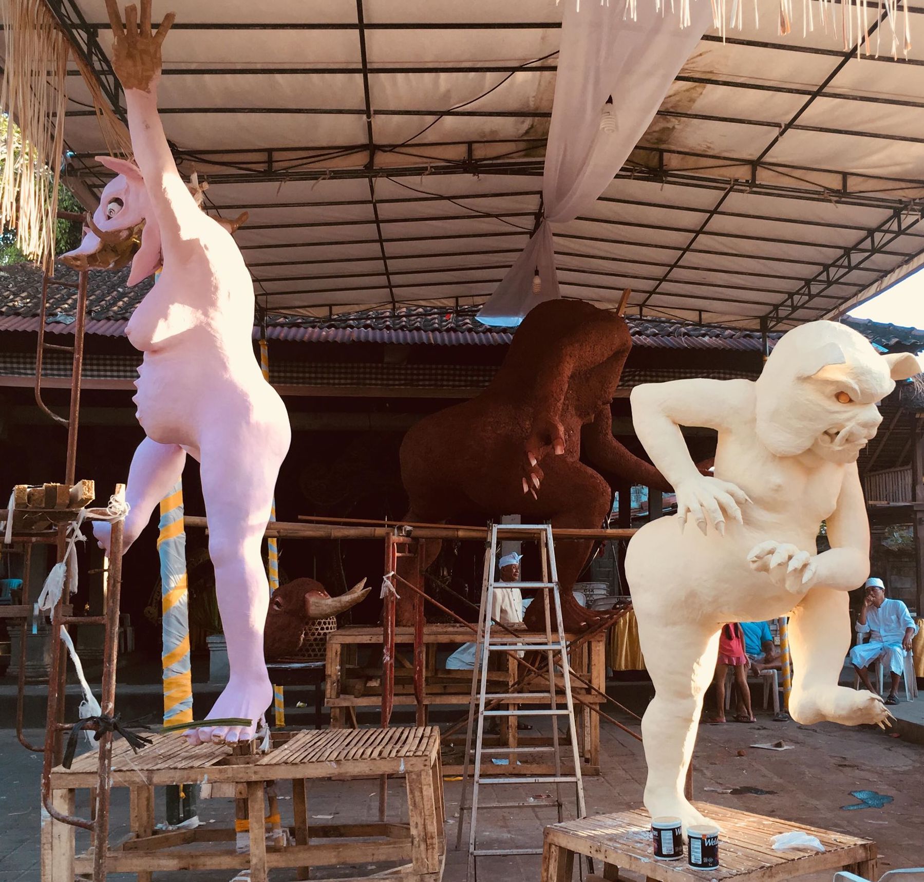 În data de 16 martie e altă poveste. Tinerii din toate comunitățile construiesc reprezentări ale spiritelor rele, proiect care începe cu câteva săptămâni înainte. Vor defila cu ele pe străzi și vor striga pentru alungarea lor. Fiecare comunitate își construiește proprii demoni la ceas de seară. În comunitatea Taman unde suntem cazați ne aflăm chiar vis-a-vis de locul de adunare unde e grădinița subterană despre care am scris aici.
