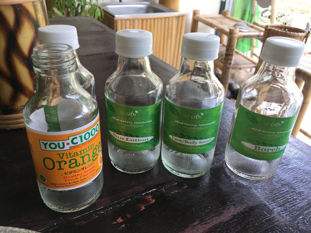 Ar fi trebuit să fim 3 persoane la curs, dar celelalte două nu au apărut, așa că am fost singură. Dewi mi-a povestit că sticlele pe care le folosește, le reciclează. Plătește pe cineva care nu are de lucru să le adune de pe unde sunt aruncate, le sterilizează, le îndepărtează eticheta și le pune eticheta Ubud Botany Interactive. De fapt, sticlele conțin ceva suc cu vitamina C, care într-adevăr sunt pe la fiecare colț de stradă lăsate.