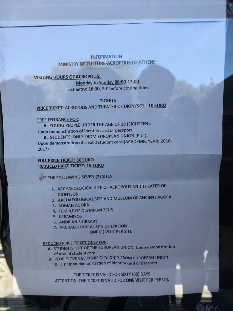 Pentru a vizita Acropolis am plătit 10 euro, deși am citit că e 25 de euro. La fel scria și pe o altă intrare, dar la ghișeu era acest afiș, așa că ne-am bucurat, evident.