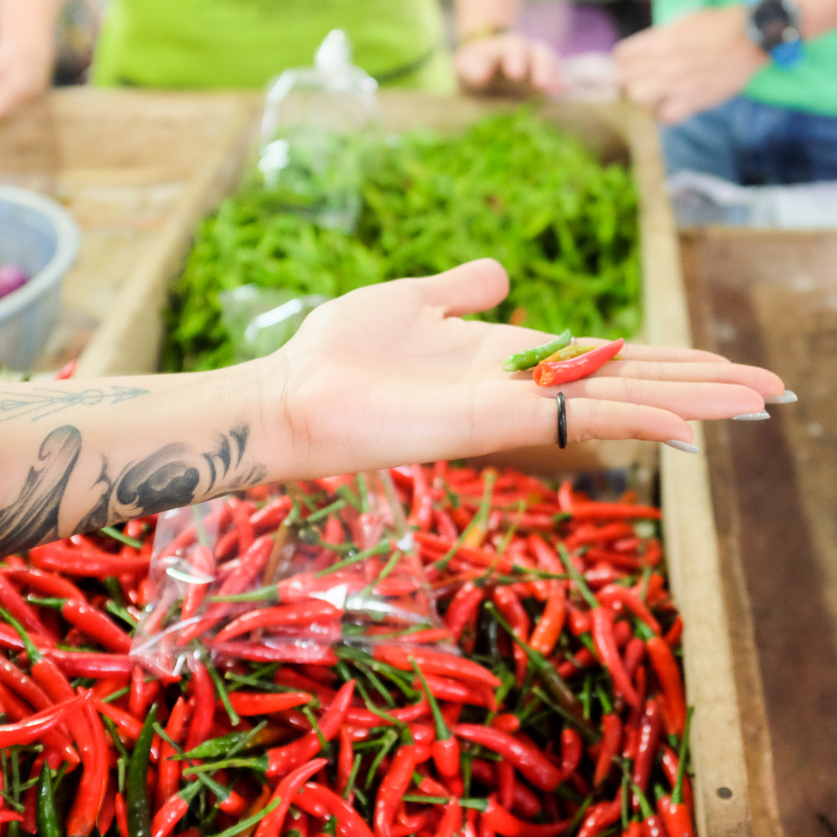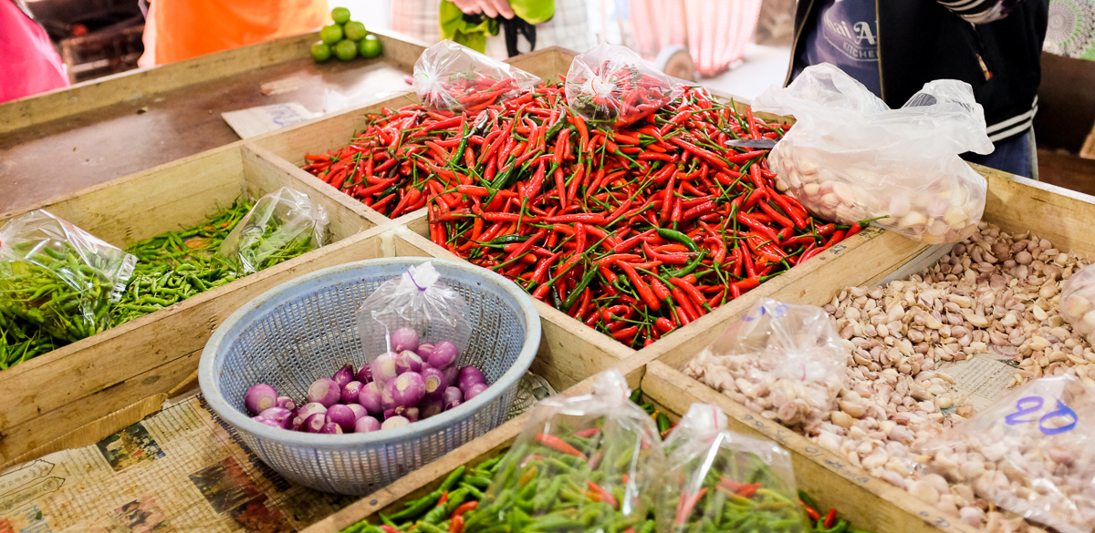 In the market we found out that the spiciest chillis are yellow ones, the green ones are medium spicy, and the red ones are the least spicy. Totally different from what we would have thought.