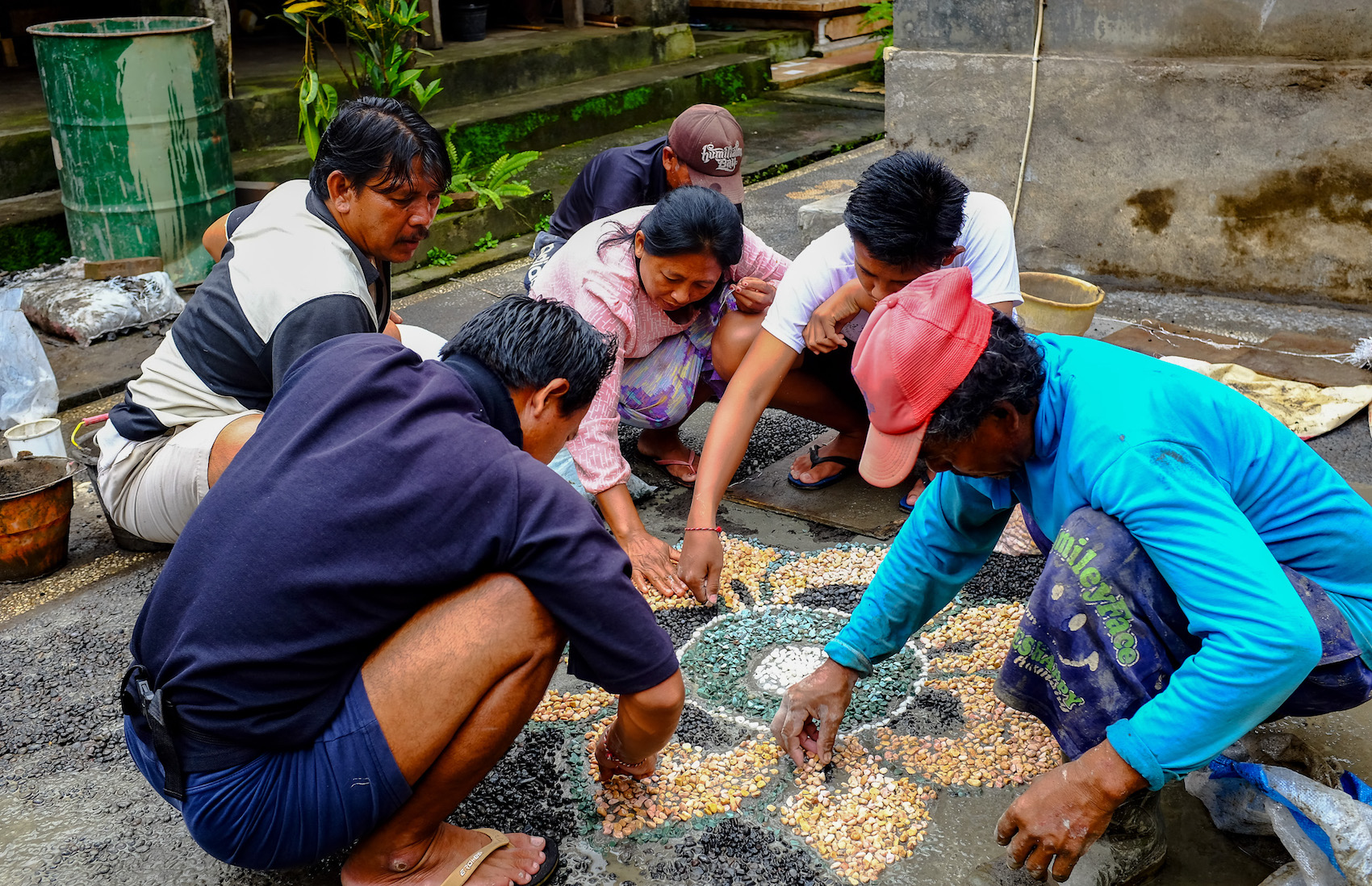 The last stop is at his family’s traditional house. It’s not unusual in Bali that when you see the gates of a house to get the impression that you’ve reached a temple. That’s what I thought, too, and I asked him if I should cover myself with a scarf, which is a normal thing to do here. He was amused and told me it was his home. We walked into a square courtyard, one of his aunts welcomed us with warm tea and we sat down a bit, just to feel the place. Several men in the family were paving a part of the yard. Here we learned the most about the Balinese families.